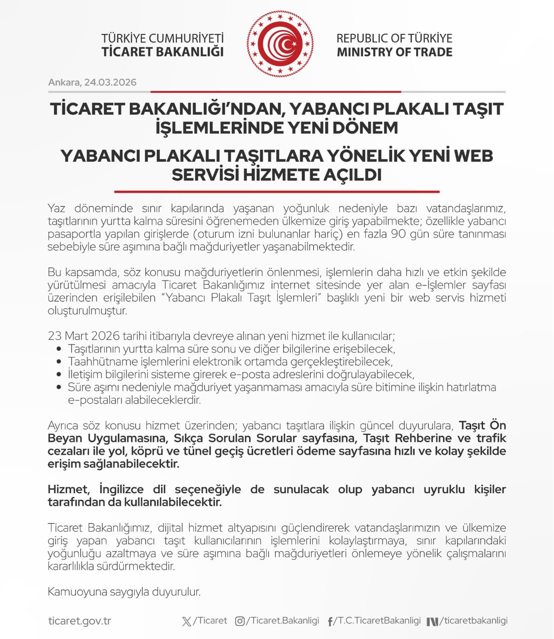 Ticaret Bakanlığı’nca Yabancı Plakalı Taşıt İşlemlerinde Yeni DönemYabancı Plakalı Taşıtlara Yönelik Yeni Web Servisi Hizmete Açıldı.